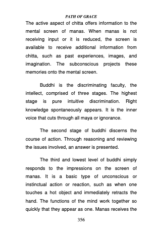 The third and lowest level of buddhi simply responds to the impressions on the screen of manas. It is a basic type of unconscious or instinctual action or reaction, such as when one touches a hot object and immediately retracts the hand. The functions of the mind work together so quickly that they appear as one. Manas receives the