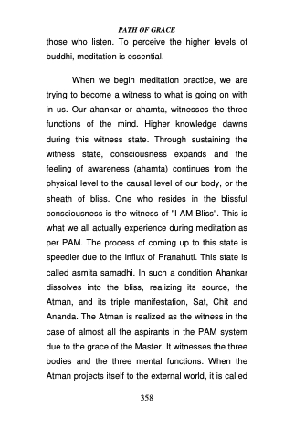When we begin meditation practice, we are trying to become a witness to what is going on with in us. Our ahankar or ahamta, witnesses the three functions of the mind. Higher knowledge dawns during this witness state. Through sustaining the witness state, consciousness expands and the feeling of awareness (ahamta) continues from the physical level to the causal level of our body, or the sheath of bliss. One who resides in the blissful consciousness is the witness of "I AM Bliss". This is what we all actually experience during meditation as per PAM. The process of coming up to this state is speedier due to the influx of Pranahuti. This state is called asmita samadhi. In such a condition Ahankar dissolves into the bliss, realizing its source, the Atman, and its triple manifestation, Sat, Chit and Ananda. The Atman is realized as the witness in the case of almost all the aspirants in the PAM system due to the grace of the Master. It witnesses the three bodies and the three mental functions. When the Atman projects itself to the external world, it is called