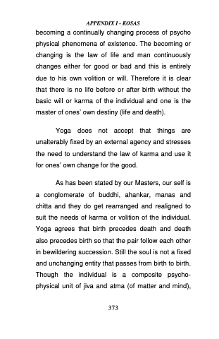 As has been stated by our Masters, our self is a conglomerate of buddhi, ahankar, manas and chitta and they do get rearranged and realigned to suit the needs of karma or volition of the individual. Yoga agrees that birth precedes death and death also precedes birth so that the pair follow each other in bewildering succession. Still the soul is not a fixed and unchanging entity that passes from birth to birth. Though the individual is a composite psycho- physical unit of jiva and atma (of matter and mind),