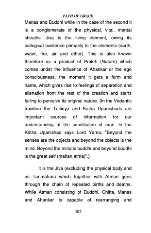 Manas and Buddhi while in the case of the second it is a conglomerate of the physical, vital, mental sheaths. Jiva is the living element, owing its biological existence primarily to the elements (earth, water, fire, air and ether). This is also known therefore as a product of Prakrti (Nature) which comes under the influence of Ahankar or the ego consciousness, the moment it gets a form and name, which gives rise to feelings of separation and alienation from the rest of the creation and starts failing to perceive its original nature. {In the Vedantic tradition the Taitiriya and Katha Upanishads are important sources of information for our understanding of the constitution of man. In the Katha Upanishad says Lord Yama, "Beyond the senses are the objects and beyond the objects is the mind. Beyond the mind is buddhi and beyond buddhi is the great self (mahan atma)".}