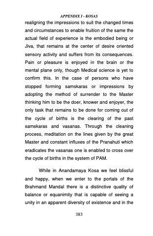 realigning the impressions to suit the changed times and circumstances to enable fruition of the same the actual field of experience is the embodied being or Jiva, that remains at the center of desire oriented sensory activity and suffers from its consequences. Pain or pleasure is enjoyed in the brain or the mental plane only, though Medical science is yet to confirm this. In the case of persons who have stopped forming samskaras or impressions by adopting the method of surrender to the Master thinking him to be the doer, knower and enjoyer, the only task that remains to be done for coming out of the cycle of births is the clearing of the past samskaras and vasanas. Through the cleaning process, meditation on the lines given by the great Master and constant influxes of the Pranahuti which eradicates the vasanas one is enabled to cross over the cycle of births in the system of PAM.