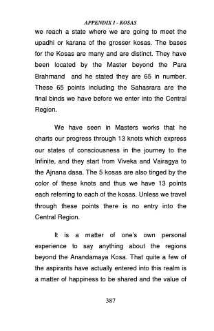 We have seen in Masters works that he charts our progress through 13 knots which express our states of consciousness in the journey to the Infinite, and they start from Viveka and Vairagya to the Ajnana dasa. The 5 kosas are also tinged by the color of these knots and thus we have 13 points each referring to each of the kosas. Unless we travel through these points there is no entry into the Central Region.