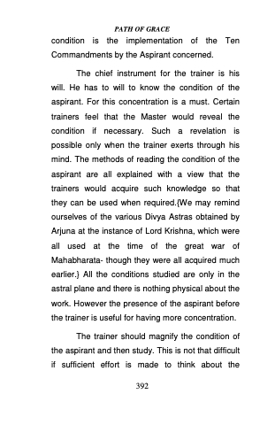 The chief instrument for the trainer is his will. He has to will to know the condition of the aspirant. For this concentration is a must. Certain trainers feel that the Master would reveal the condition if necessary. Such a revelation is possible only when the trainer exerts through his mind. The methods of reading the condition of the aspirant are all explained with a view that the trainers would acquire such knowledge so that they can be used when required.{We may remind ourselves of the various Divya Astras obtained by Arjuna at the instance of Lord Krishna, which were all used at the time of the great war of Mahabharata- though they were all acquired much earlier.} All the conditions studied are only in the astral plane and there is nothing physical about the work. However the presence of the aspirant before the trainer is useful for having more concentration.