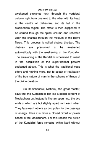 awakened stretches forth through the vertebral column right from one end to the other with its head at the centre of Sahasrara and its tail in the Mooladhara region. The effect is then supposed to be carried through the spinal column and reflected upon the chakras through the medium of the nerve fibres. This process is called chakra bhedan. The chakras are presumed to be awakened automatically with the awakening of the Kundalini. The awakening of the Kundalini is believed to result in the acquisition of the super-normal powers explained above. This is what the traditional yoga offers and nothing more, not to speak of realisation of the true nature of man in the scheme of things of the divine creation.