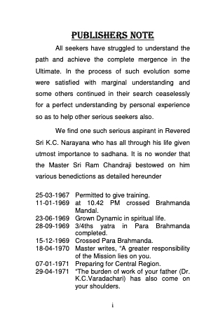 We find one such serious aspirant in Revered Sri K.C. Narayana who has all through his life given utmost importance to sadhana. It is no wonder that the Master Sri Ram Chandraji bestowed on him various benedictions as detailed hereunder