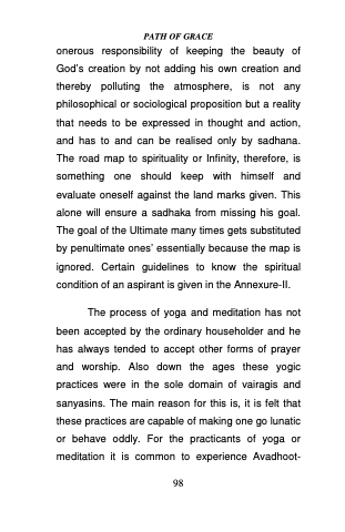 onerous responsibility of keeping the beauty of God’s creation by not adding his own creation and thereby polluting the atmosphere, is not any philosophical or sociological proposition but a reality that needs to be expressed in thought and action, and has to and can be realised only by sadhana. The road map to spirituality or Infinity, therefore, is something one should keep with himself and evaluate oneself against the land marks given. This alone will ensure a sadhaka from missing his goal. The goal of the Ultimate many times gets substituted by penultimate ones’ essentially because the map is ignored. Certain guidelines to know the spiritual condition of an aspirant is given in the Annexure-II.