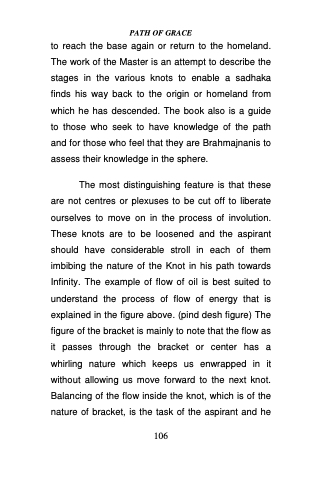 to reach the base again or return to the homeland. The work of the Master is an attempt to describe the stages in the various knots to enable a sadhaka finds his way back to the origin or homeland from which he has descended. The book also is a guide to those who seek to have knowledge of the path and for those who feel that they are Brahmajnanis to assess their knowledge in the sphere.