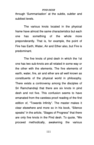 The five knots of pind desh in which the 1st one has two sub-knots are all related in some way or the other with the elements. The five elements of earth, water, fire, air and ether are all well known as constituents of the physical world in philosophy. There exists a controversy among the disciples of Sri Ramchandraji that there are six knots in pind desh and not five. This confusion seems to have emanated from the careless proof reading of the first edition of, “Towards Infinity”. The master makes it clear elsewhere and more so in his book, “Silence speaks” in the article, “Stages of Progress” that there are only five knots in the Pind desh. To quote, “We proceed methodically, awakening the various