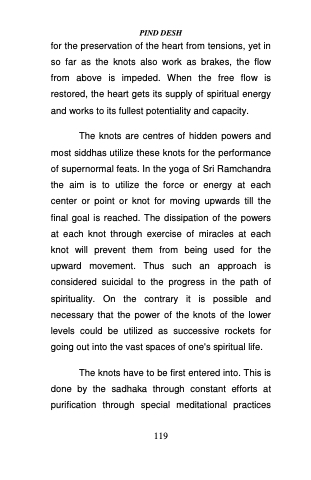 The knots are centres of hidden powers and most siddhas utilize these knots for the performance of supernormal feats. In the yoga of Sri Ramchandra the aim is to utilize the force or energy at each center or point or knot for moving upwards till the final goal is reached. The dissipation of the powers at each knot through exercise of miracles at each knot will prevent them from being used for the upward movement. Thus such an approach is considered suicidal to the progress in the path of spirituality. On the contrary it is possible and necessary that the power of the knots of the lower levels could be utilized as successive rockets for going out into the vast spaces of one's spiritual life.