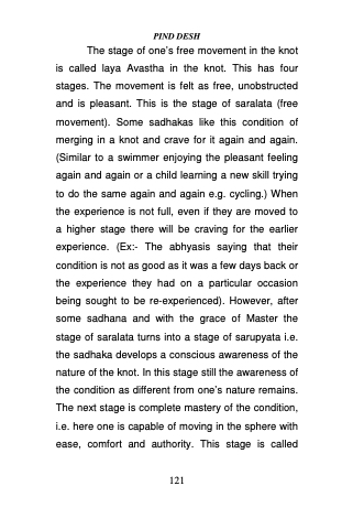 The stage of one’s free movement in the knot is called laya Avastha in the knot. This has four stages. The movement is felt as free, unobstructed and is pleasant. This is the stage of saralata (free movement). Some sadhakas like this condition of merging in a knot and crave for it again and again. (Similar to a swimmer enjoying the pleasant feeling again and again or a child learning a new skill trying to do the same again and again e.g. cycling.) When the experience is not full, even if they are moved to a higher stage there will be craving for the earlier experience. (Ex:- The abhyasis saying that their condition is not as good as it was a few days back or the experience they had on a particular occasion being sought to be re-experienced). However, after some sadhana and with the grace of Master the stage of saralata turns into a stage of sarupyata i.e. the sadhaka develops a conscious awareness of the nature of the knot. In this stage still the awareness of the condition as different from one’s nature remains. The next stage is complete mastery of the condition, i.e. here one is capable of moving in the sphere with ease, comfort and authority. This stage is called