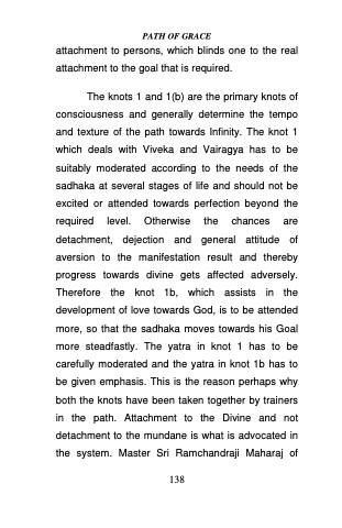 The knots 1 and 1(b) are the primary knots of consciousness and generally determine the tempo and texture of the path towards Infinity. The knot 1 which deals with Viveka and Vairagya has to be suitably moderated according to the needs of the sadhaka at several stages of life and should not be excited or attended towards perfection beyond the required level. Otherwise the chances are detachment, dejection and general attitude of aversion to the manifestation result and thereby progress towards divine gets affected adversely. Therefore the knot 1b, which assists in the development of love towards God, is to be attended more, so that the sadhaka moves towards his Goal more steadfastly. The yatra in knot 1 has to be carefully moderated and the yatra in knot 1b has to be given emphasis. This is the reason perhaps why both the knots have been taken together by trainers in the path. Attachment to the Divine and not detachment to the mundane is what is advocated in the system. Master Sri Ramchandraji Maharaj of