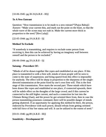“Minds of all be drawn together like ropes and established at one place. If this place is transmitted to with a firm will, minds of most people will be seen to come to the state of suspension; and being spared from this effect is impossible for anybody. The effect will be sharp in proportion to the sharpness of the single- directed transmission at the point fixed by one’s own firm will. This is the first stage of this transmission. Now starts the second part: These minds which have been drawn like ropes and established at one place, if connected upwards, there will be subtle effect on the thoughts of the large crowd; and if this current be connected to the still higher current, and such a connection be lost into the Ultimate Being (Zaat), and the power be got oriented there from, then in case the person transmitting possesses command, there will be possible danger of minds getting shattered. If an opportunity for applying this method be there, the person, endowed by Providence with such power, should refrain from getting oriented with full force of his/ her status and will. It can be utilized to the extent of need.”