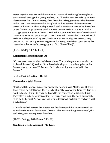 merge together into one and the same unit. When all chakras (plexuses) have been crossed through this (new) method, i.e. all chakras are brought up to have identity with the Ultimate Being, then that whole thing (state) is to be drowned in the Zaat. This practice on the disciple should be continued for some time, which will result in (the development of) such a condition as may be difficult to be the fortune of quite many good and fine people, and can not be arrived at through years and years of one’s own hard practice. Restlessness of mind would have come to an end just through this first method. This method is very difficult, and can not be practiced by everybody. One whom God grants affinity, may perform it. I am telling some thing secret for being noted down: just this is the method to achieve perfect merging with God (Fana-fillah)”.
