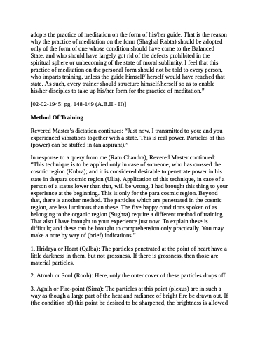 In response to a query from me (Ram Chandra), Revered Master continued: “This technique is to be applied only in case of someone, who has crossed the cosmic region (Kubra); and it is considered desirable to penetrate power in his state in thepara cosmic region (Ulia). Application of this technique, in case of a person of a status lower than that, will be wrong. I had brought this thing to your experience at the beginning. This is only for the para cosmic region. Beyond that, there is another method. The particles which are penetrated in the cosmic region, are less luminous than these. The five happy conditions spoken of as belonging to the organic region (Sughra) require a different method of training. That also I have brought to your experience just now. To explain these is difficult; and these can be brought to comprehension only practically. You may make a note by way of (brief) indications.”