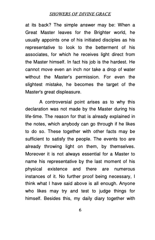 A controversial point arises as to why this declaration was not made by the Master during his life-time. The reason for that is already explained in the notes, which anybody can go through if he likes to do so. These together with other facts may be sufficient to satisfy the people. The events too are already throwing light on them, by themselves. Moreover it is not always essential for a Master to name his representative by the last moment of his physical existence and there are numerous instances of it. No further proof being necessary, I think what I have said above is all enough. Anyone who likes may try and test to judge things for himself. Besides this, my daily diary together with