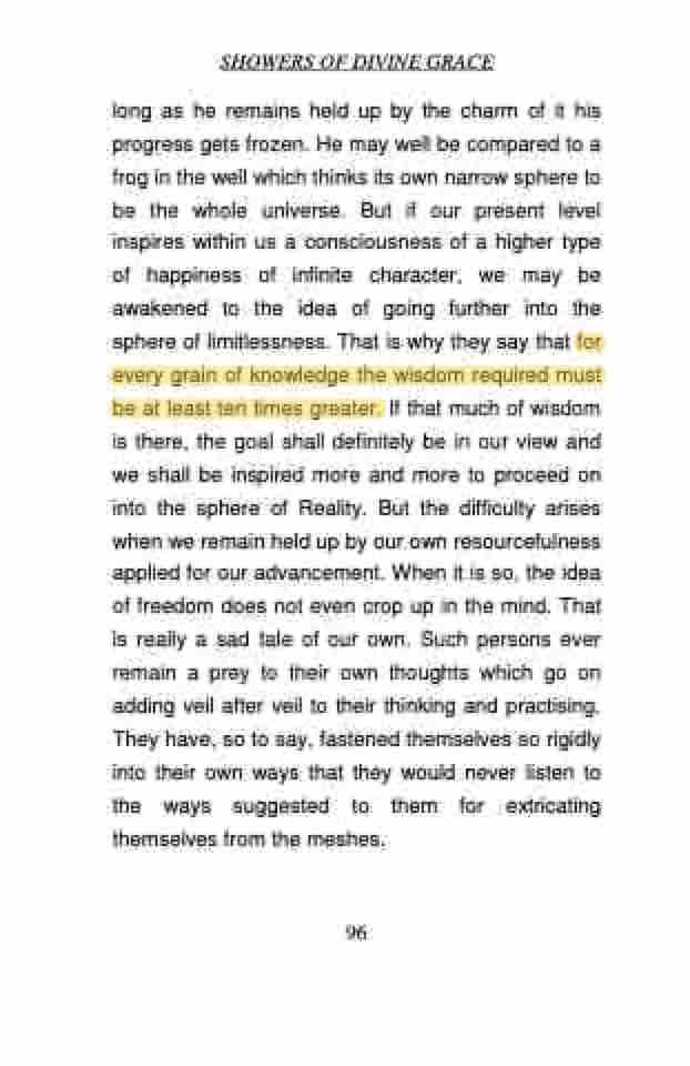 long as he remains held up by the charm of it his progress gets frozen. He may well be compared to a frog in the well which thinks its own narrow sphere to be the whole universe. But if our present level inspires within us a consciousness of a higher type of happiness of infinite character, we may be awakened to the idea of going further into the sphere of limitlessness. That is why they say that for every grain of knowledge the wisdom required must be at least ten times greater. If that much of wisdom is there, the goal shall definitely be in our view and we shall be inspired more and more to proceed on into the sphere of Reality. But the difficulty arises when we remain held up by our own resourcefulness applied for our advancement. When it is so, the idea of freedom does not even crop up in the mind. That is really a sad tale of our own. Such persons ever remain a prey to their own thoughts which go on adding veil after veil to their thinking and practising. They have, so to say, fastened themselves so rigidly into their own ways that they would never listen to the ways suggested to them for extricating themselves from the meshes.