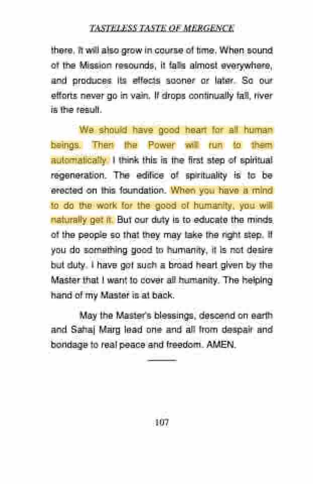 We should have good heart for all human beings. Then the Power will run to them automatically. I think this is the first step of spiritual regeneration. The edifice of spirituality is to be erected on this foundation. When you have a mind to do the work for the good of humanity, you will naturally get it. But our duty is to educate the minds of the people so that they may take the right step. If you do something good to humanity, it is not desire but duty. I have got such a broad heart given by the Master that I want to cover all humanity. The helping hand of my Master is at back.