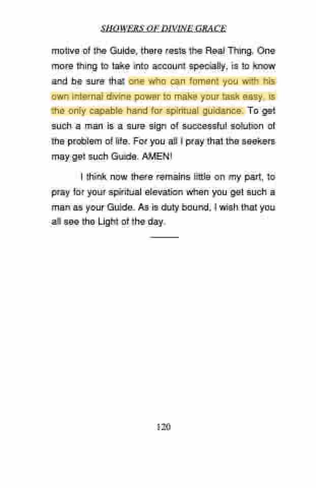motive of the Guide, there rests the Real Thing. One more thing to take into account specially, is to know and be sure that one who can foment you with his own internal divine power to make your task easy, is the only capable hand for spiritual guidance. To get such a man is a sure sign of successful solution of the problem of life. For you all I pray that the seekers may get such Guide. AMEN!