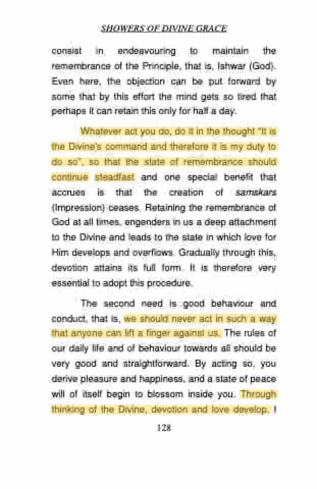 Whatever act you do, do it in the thought “It is the Divine's command and therefore it is my duty to do so”, so that the state of remembrance should continue steadfast and one special benefit that accrues is that the creation of samskars (Impression) ceases. Retaining the remembrance of God at all times, engenders in us a deep attachment to the Divine and leads to the state in which love for Him develops and overflows. Gradually through this, devotion attains its full form. It is therefore very essential to adopt this procedure.