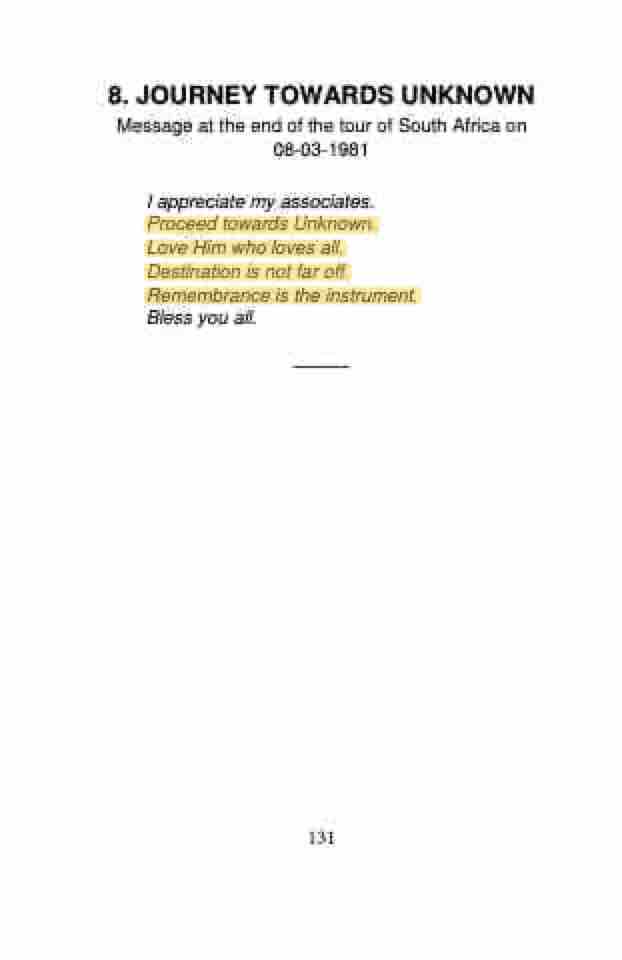 8. JOURNEY TOWARDS UNKNOWN Message at the end of the tour of South Africa on 08-03-1981 I appreciate my associates. Proceed towards Unknown. Love Him who loves all. Destination is not far off. Remembrance is the instrument. Bless you all. ——— 131