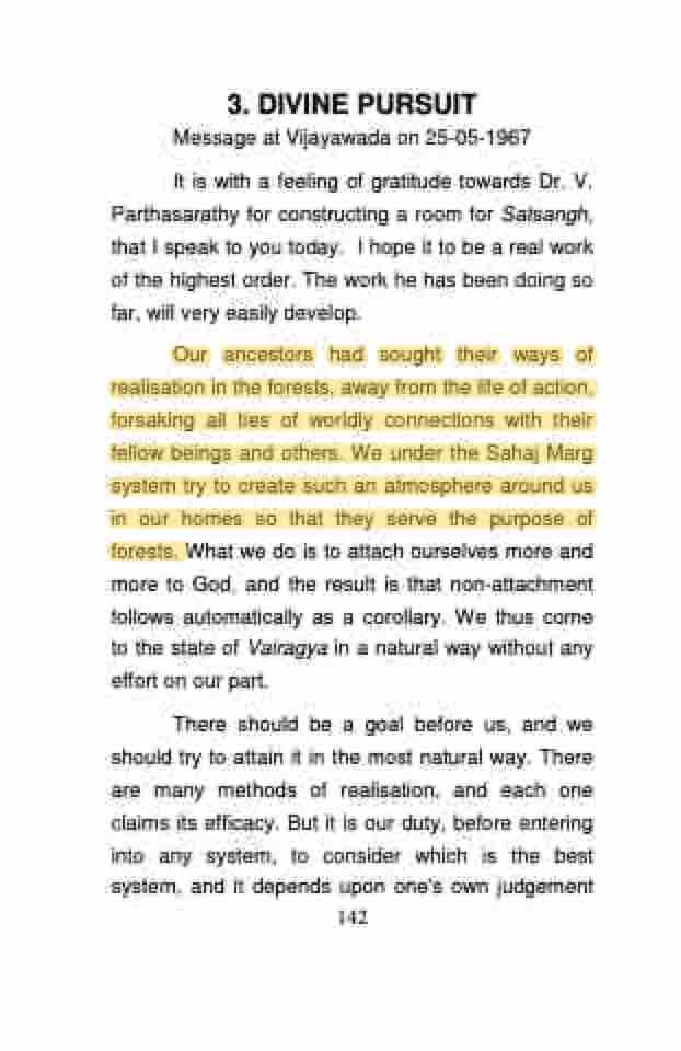 Our ancestors had sought their ways of realisation in the forests, away from the life of action, forsaking all ties of worldly connections with their fellow beings and others. We under the Sahaj Marg system try to create such an atmosphere around us in our homes so that they serve the purpose of forests. What we do is to attach ourselves more and more to God, and the result is that non-attachment follows automatically as a corollary. We thus come to the state of Vairagya in a natural way without any effort on our part.