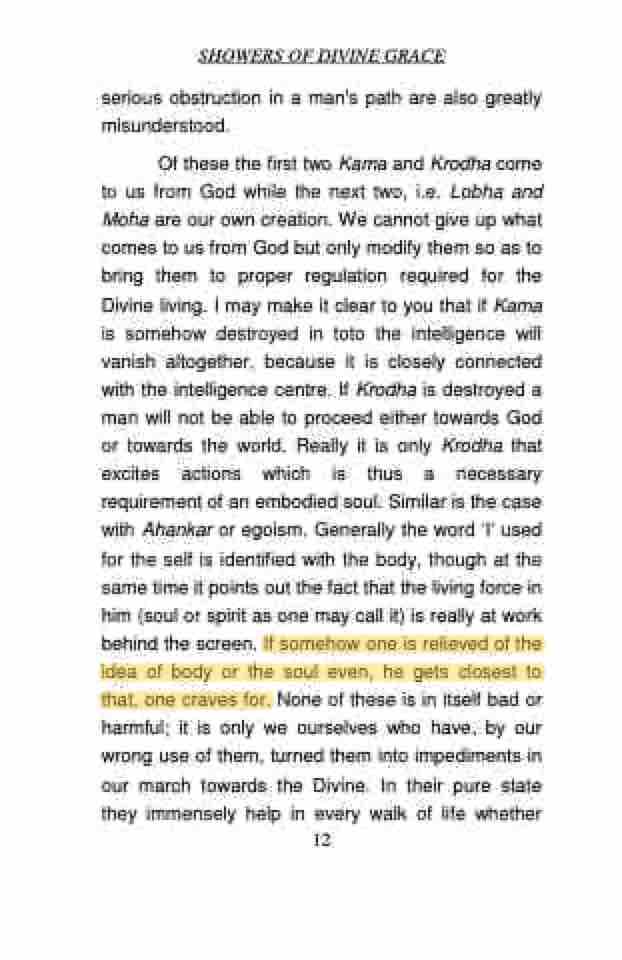 Of these the first two Kama and Krodha come to us from God while the next two, i.e. Lobha and Moha are our own creation. We cannot give up what comes to us from God but only modify them so as to bring them to proper regulation required for the Divine living. I may make it clear to you that if Kama is somehow destroyed in toto the intelligence will vanish altogether, because it is closely connected with the intelligence centre. If Krodha is destroyed a man will not be able to proceed either towards God or towards the world. Really it is only Krodha that excites actions which is thus a necessary requirement of an embodied soul. Similar is the case with Ahankar or egoism. Generally the word ‘I' used for the self is identified with the body, though at the same time it points out the fact that the living force in him (soul or spirit as one may call it) is really at work behind the screen. If somehow one is relieved of the idea of body or the soul even, he gets closest to that, one craves for. None of these is in itself bad or harmful; it is only we ourselves who have, by our wrong use of them, turned them into impediments in our march towards the Divine. In their pure state they immensely help in every walk of life whether