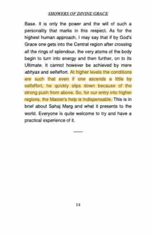 Base. It is only the power and the will of such a personality that marks in this respect. As for the highest human approach, I may say that if by God's Grace one gets into the Central region after crossing all the rings of splendour, the very atoms of the body begin to turn into energy and then further, on to its Ultimate. It cannot however be achieved by mere abhyas and selfeffort. At higher levels the conditions are such that even if one ascends a little by selfeffort, he quickly slips down because of the strong push from above. So, for our entry into higher regions, the Master's help is indispensable. This is in brief about Sahaj Marg and what it presents to the world. Everyone is quite welcome to try and have a practical experience of it.