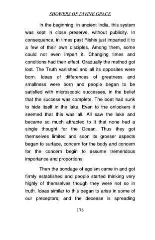 In the beginning, in ancient India, this system was kept in close preserve, without publicity. In consequence, in times past Rishis just imparted it to a few of their own disciples. Among them, some could not even impart it. Changing times and conditions had their effect. Gradually the method got lost. The Truth vanished and all its opposites were born. Ideas of differences of greatness and smallness were born and people began to be satisfied with microscopic successes, in the belief that the success was complete. The boat had sunk to hide itself in the lake. Even to the onlookers it seemed that this was all. All saw the lake and became so much attracted to it that none had a single thought for the Ocean. Thus they got themselves limited and soon its grosser aspects began to surface, concern for the body and concern for the concern begin to assume tremendous importance and proportions.