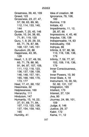 28, 87, 90 Impressions, 4, 45, 46 Impulse, 136, 138 Indispensable, 14, 63 Individuality, 156 Indriyas, 86