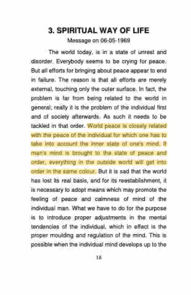 The world today, is in a state of unrest and disorder. Everybody seems to be crying for peace. But all efforts for bringing about peace appear to end in failure. The reason is that all efforts are merely external, touching only the outer surface. In fact, the problem is far from being related to the world in general; really it is the problem of the individual first and of society afterwards. As such it needs to be tackled in that order. World peace is closely related with the peace of the individual for which one has to take into account the inner state of one's mind. If man's mind is brought to the state of peace and order, everything in the outside world will get into order in the same colour. But it is sad that the world has lost its real basis, and for its reestablishment, it is necessary to adopt means which may promote the feeling of peace and calmness of mind of the individual man. What we have to do for the purpose is to introduce proper adjustments in the mental tendencies of the individual, which in effect is the proper moulding and regulation of the mind. This is possible when the individual mind develops up to the