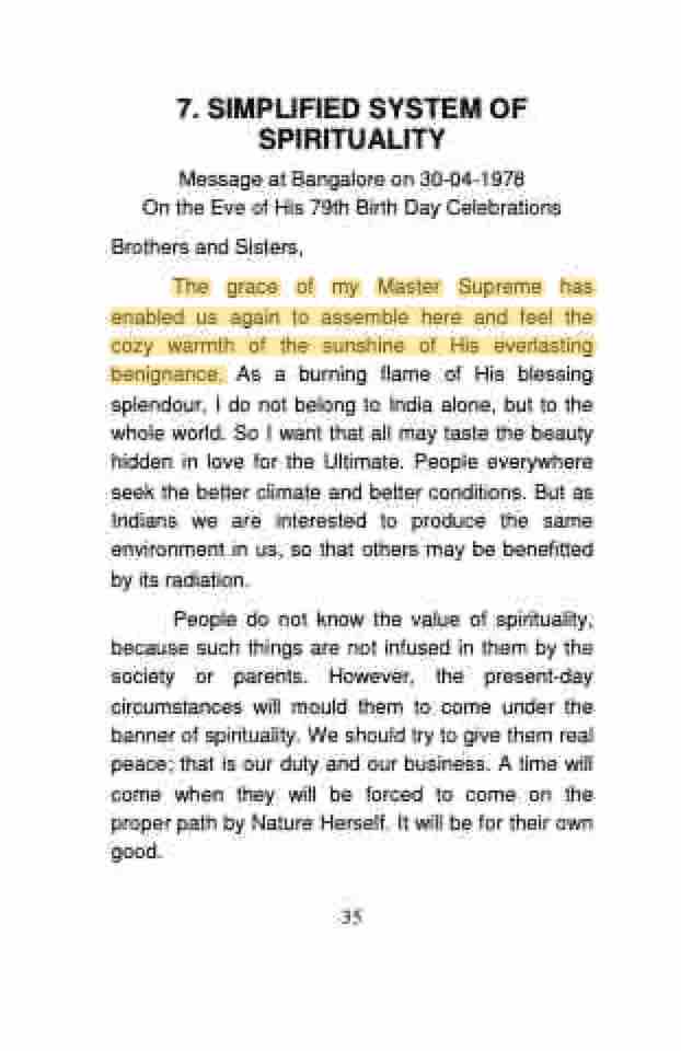 The grace of my Master Supreme has enabled us again to assemble here and feel the cozy warmth of the sunshine of His everlasting benignance. As a burning flame of His blessing splendour, I do not belong to India alone, but to the whole world. So I want that all may taste the beauty hidden in love for the Ultimate. People everywhere seek the better climate and better conditions. But as Indians we are interested to produce the same environment in us, so that others may be benefitted by its radiation.