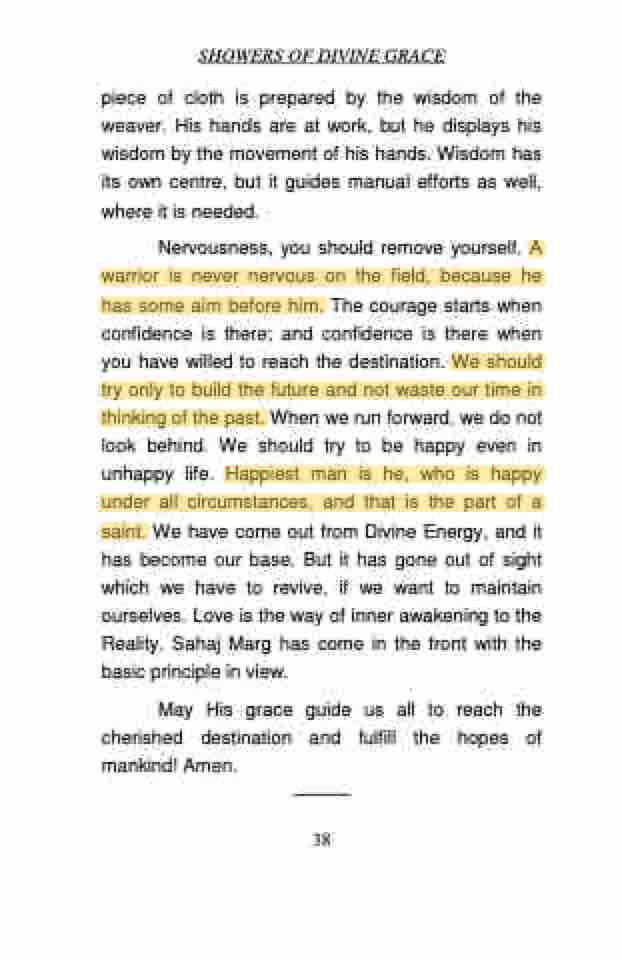 Nervousness, you should remove yourself. A warrior is never nervous on the field, because he has some aim before him. The courage starts when confidence is there; and confidence is there when you have willed to reach the destination. We should try only to build the future and not waste our time in thinking of the past. When we run forward, we do not look behind. We should try to be happy even in unhappy life. Happiest man is he, who is happy under all circumstances, and that is the part of a saint. We have come out from Divine Energy, and it has become our base. But it has gone out of sight which we have to revive, if we want to maintain ourselves. Love is the way of inner awakening to the Reality. Sahaj Marg has come in the front with the basic principle in view.