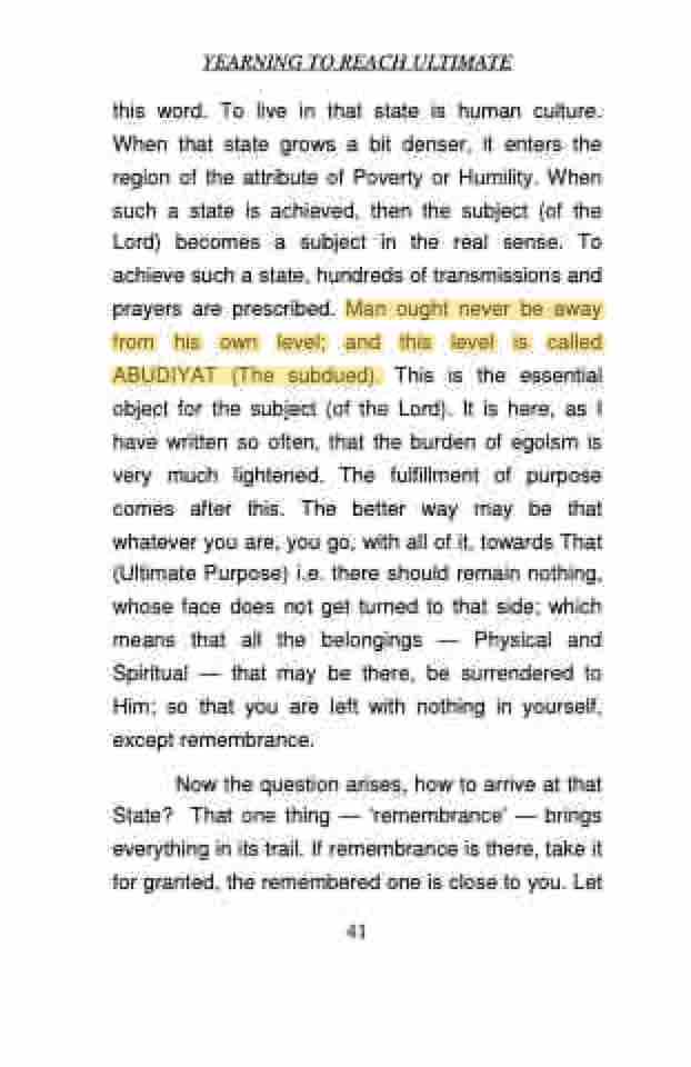 this word. To live in that state is human culture. When that state grows a bit denser, it enters the region of the attribute of Poverty or Humility. When such a state is achieved, then the subject (of the Lord) becomes a subject in the real sense. To achieve such a state, hundreds of transmissions and prayers are prescribed. Man ought never be away from his own level; and this level is called ABUDIYAT (The subdued). This is the essential object for the subject (of the Lord). It is here, as I have written so often, that the burden of egoism is very much lightened. The fulfillment of purpose comes after this. The better way may be that whatever you are, you go, with all of it, towards That (Ultimate Purpose) i.e. there should remain nothing, whose face does not get turned to that side; which means that all the belongings — Physical and Spiritual — that may be there, be surrendered to Him; so that you are left with nothing in yourself, except remembrance.