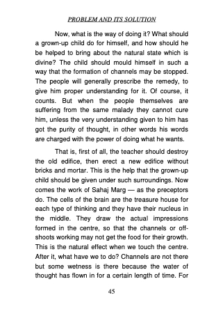 That is, first of all, the teacher should destroy the old edifice, then erect a new edifice without bricks and mortar. This is the help that the grown-up child should be given under such surroundings. Now comes the work of Sahaj Marg — as the preceptors do. The cells of the brain are the treasure house for each type of thinking and they have their nucleus in the middle. They draw the actual impressions formed in the centre, so that the channels or off- shoots working may not get the food for their growth. This is the natural effect when we touch the centre. After it, what have we to do? Channels are not there but some wetness is there because the water of thought has flown in for a certain length of time. For