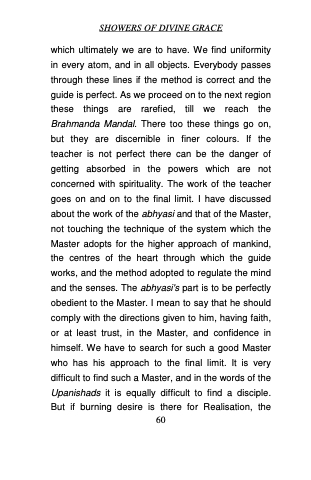 which ultimately we are to have. We find uniformity in every atom, and in all objects. Everybody passes through these lines if the method is correct and the guide is perfect. As we proceed on to the next region these things are rarefied, till we reach the Brahmanda Mandal. There too these things go on, but they are discernible in finer colours. If the teacher is not perfect there can be the danger of getting absorbed in the powers which are not concerned with spirituality. The work of the teacher goes on and on to the final limit. I have discussed about the work of the abhyasi and that of the Master, not touching the technique of the system which the Master adopts for the higher approach of mankind, the centres of the heart through which the guide works, and the method adopted to regulate the mind and the senses. The abhyasi's part is to be perfectly obedient to the Master. I mean to say that he should comply with the directions given to him, having faith, or at least trust, in the Master, and confidence in himself. We have to search for such a good Master who has his approach to the final limit. It is very difficult to find such a Master, and in the words of the Upanishads it is equally difficult to find a disciple.