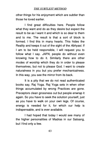 I find great difficulties here. People follow what they want and do as they desire but expect the result to be as I want it and which is so dear to them and to me. The result is that a sort of block is formed. I find this in many hearts. This hides the Reality and keeps it out of the sight of the Abhyasi. If I am to be held responsible, I will request you to follow what I say. JAPA, people do without even knowing how to do it. Similarly there are other modes of worship which they do in order to please themselves, but not to please God. I want to create naturalness in you but you prefer mechanicalness. In this way, you see the mirror from its back.