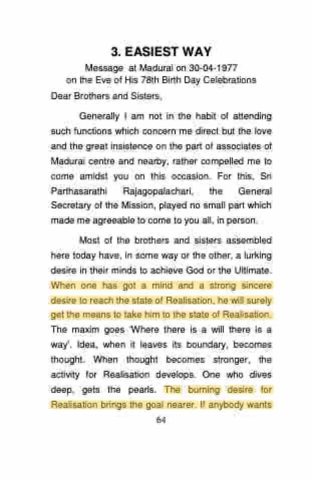 Most of the brothers and sisters assembled here today have, in some way or the other, a lurking desire in their minds to achieve God or the Ultimate. When one has got a mind and a strong sincere desire to reach the state of Realisation, he will surely get the means to take him to the state of Realisation. The maxim goes ‘Where there is a will there is a way'. Idea, when it leaves its boundary, becomes thought. When thought becomes stronger, the activity for Realisation develops. One who dives deep, gets the pearls. The burning desire for Realisation brings the goal nearer. If anybody wants