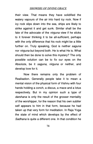 their view. That means they have solidified the watery vapours of the air into hard icy rock. Now if icy rock slips down into the sea, ships are likely to strike against it and get sunk. Similar shall be the fate of the advocate of the nirguna view if he sticks to it forever thinking it to be all-sufficient, perhaps with the only difference that his rock might be a little further on. Truly speaking, God is neither saguna nor nirguna but beyond both. He is what He is. What should then be done to solve this mystery? The only possible solution can be to fix our eyes on the Absolute, be it saguna, nirguna or neither, and develop love for it.