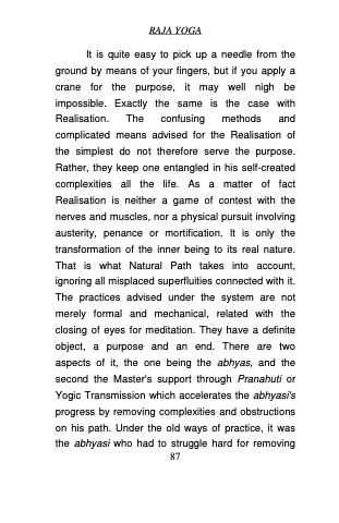 It is quite easy to pick up a needle from the ground by means of your fingers, but if you apply a crane for the purpose, it may well nigh be impossible. Exactly the same is the case with Realisation. The confusing methods and complicated means advised for the Realisation of the simplest do not therefore serve the purpose. Rather, they keep one entangled in his self-created complexities all the life. As a matter of fact Realisation is neither a game of contest with the nerves and muscles, nor a physical pursuit involving austerity, penance or mortification. It is only the transformation of the inner being to its real nature. That is what Natural Path takes into account, ignoring all misplaced superfluities connected with it. The practices advised under the system are not merely formal and mechanical, related with the closing of eyes for meditation. They have a definite object, a purpose and an end. There are two aspects of it, the one being the abhyas, and the second the Master's support through Pranahuti or Yogic Transmission which accelerates the abhyasi's progress by removing complexities and obstructions on his path. Under the old ways of practice, it was