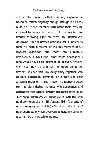 lifetime. The reason for that is already explained in the notes, which anybody can go through if he likes to do so. These together with other facts may be sufficient to satisfy the people. The events too are already throwing light on them, by themselves. Moreover it is not always essential for a master to name his representative by the last moment of his physical existence and there are numerous instances of it. No further proof being necessary, I think what I have said above is all enough. Anyone who likes may try and test to judge things for himself. Besides this, my daily diary together with master's occasional comment on it may also offer sufficient proof of it. The master frequently quoted from my diary during his talks with associates and quotations from it have already appeared in the book `Shri Ram Sandesh'. All these points together with my diary notes of the 15th August 1931 (the date of master merging into infinity) offer clear indications of my present state which everyone is quite welcome to ascertain by any possible means.