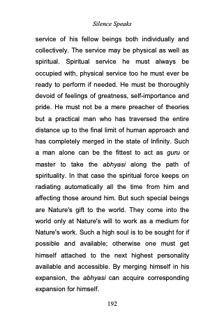 service of his fellow beings both individually and collectively. The service may be physical as well as spiritual. Spiritual service he must always be occupied with, physical service too he must ever be ready to perform if needed. He must be thoroughly devoid of feelings of greatness, self-importance and pride. He must not be a mere preacher of theories but a practical man who has traversed the entire distance up to the final limit of human approach and has completely merged in the state of Infinity. Such a man alone can be the fittest to act as guru or master to take the abhyasi along the path of spirituality. In that case the spiritual force keeps on radiating automatically all the time from him and affecting those around him. But such special beings are Nature's gift to the world. They come into the world only at Nature's will to work as a medium for Nature's work. Such a high soul is to be sought for if possible and available; otherwise one must get himself attached to the next highest personality available and accessible. By merging himself in his expansion, the abhyasi can acquire corresponding expansion for himself.