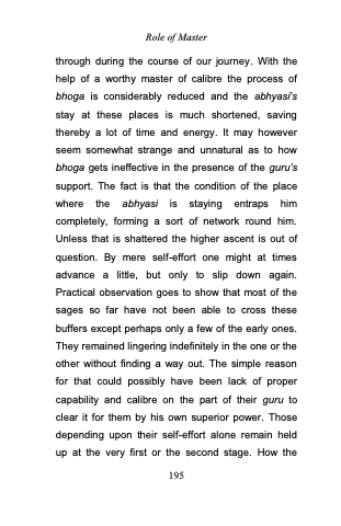 through during the course of our journey. With the help of a worthy master of calibre the process of bhoga is considerably reduced and the abhyasi‟s stay at these places is much shortened, saving thereby a lot of time and energy. It may however seem somewhat strange and unnatural as to how bhoga gets ineffective in the presence of the guru‟s support. The fact is that the condition of the place where the abhyasi is staying entraps him completely, forming a sort of network round him. Unless that is shattered the higher ascent is out of question. By mere self-effort one might at times advance a little, but only to slip down again. Practical observation goes to show that most of the sages so far have not been able to cross these buffers except perhaps only a few of the early ones. They remained lingering indefinitely in the one or the other without finding a way out. The simple reason for that could possibly have been lack of proper capability and calibre on the part of their guru to clear it for them by his own superior power. Those depending upon their self-effort alone remain held up at the very first or the second stage. How the
