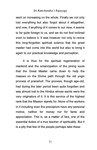 It is thus for the spiritual regeneration of mankind and the emancipation of the pining souls that the Great Master came down to help the masses on the Divine path through the old yogic process of pranahuti. The process, though age-old, had during the later period been quite forgotten and was almost lost to the Hindus whose saints were the very originators of it. It is this service of the highest rank that the Mission stands for. None of the workers in it including even the preceptors have any personal motive, neither for money nor for fame and appreciation. This is, as a matter of fact, one of the essential duties of a true teacher of spirituality. But it is a pity that few of the people perhaps take these