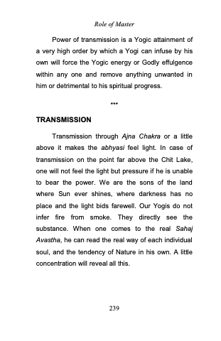 Power of transmission is a Yogic attainment of a very high order by which a Yogi can infuse by his own will force the Yogic energy or Godly effulgence within any one and remove anything unwanted in him or detrimental to his spiritual progress.