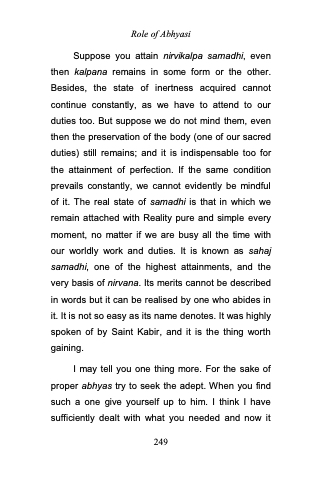 Suppose you attain nirvikalpa samadhi, even then kalpana remains in some form or the other. Besides, the state of inertness acquired cannot continue constantly, as we have to attend to our duties too. But suppose we do not mind them, even then the preservation of the body (one of our sacred duties) still remains; and it is indispensable too for the attainment of perfection. If the same condition prevails constantly, we cannot evidently be mindful of it. The real state of samadhi is that in which we remain attached with Reality pure and simple every moment, no matter if we are busy all the time with our worldly work and duties. It is known as sahaj samadhi, one of the highest attainments, and the very basis of nirvana. Its merits cannot be described in words but it can be realised by one who abides in it. It is not so easy as its name denotes. It was highly spoken of by Saint Kabir, and it is the thing worth gaining.