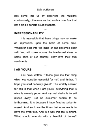 You have written, ―Please give me that thing which you consider essential for me‖, and further, ―I hope you shall certainly give it‖. The worldly answer for this is that when I am yours, everything that is mine is already yours. And my real desire is to sell myself away. But no customer seems to be forthcoming. It is because I have fixed no price for myself. And such are the times that none wants to have me even free. And in a way this too is alright. What should one do with a handful of bones?