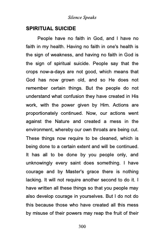 People have no faith in God, and I have no faith in my health. Having no faith in one's health is the sign of weakness, and having no faith in God is the sign of spiritual suicide. People say that the crops now-a-days are not good, which means that God has now grown old, and so He does not remember certain things. But the people do not understand what confusion they have created in His work, with the power given by Him. Actions are proportionately continued. Now, our actions went against the Nature and created a mess in the environment, whereby our own throats are being cut. These things now require to be cleaned, which is being done to a certain extent and will be continued. It has all to be done by you people only, and unknowingly every saint does something. I have courage and by Master's grace there is nothing lacking. It will not require another second to do it. I have written all these things so that you people may also develop courage in yourselves. But I do not do this because those who have created all this mess by misuse of their powers may reap the fruit of their