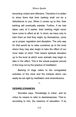 becoming violent and offensive. Therefore it is better to show them that their barking shall not be a disturbance to you. When it comes up to this, their barking will eventually subside. Further, if we had taken care of it earlier, their barking might never have come to effect at all. In short, we have only to train them so that they might, by themselves, come up to proper regulation and discipline. The only way for that would be to raise ourselves up to the level where they may also begin to take the effect of our inner state of mind. That means spiritual elevation up to the level at which even animals may begin to take in the effect. This is the actual purpose served in the long run by the practice of meditation.