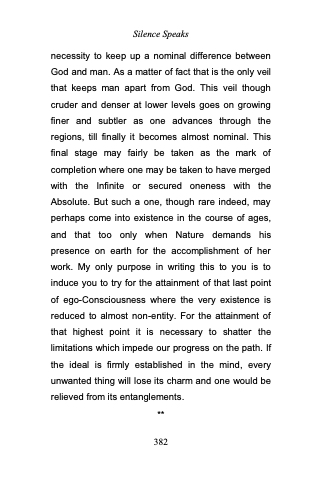 necessity to keep up a nominal difference between God and man. As a matter of fact that is the only veil that keeps man apart from God. This veil though cruder and denser at lower levels goes on growing finer and subtler as one advances through the regions, till finally it becomes almost nominal. This final stage may fairly be taken as the mark of completion where one may be taken to have merged with the Infinite or secured oneness with the Absolute. But such a one, though rare indeed, may perhaps come into existence in the course of ages, and that too only when Nature demands his presence on earth for the accomplishment of her work. My only purpose in writing this to you is to induce you to try for the attainment of that last point of ego-Consciousness where the very existence is reduced to almost non-entity. For the attainment of that highest point it is necessary to shatter the limitations which impede our progress on the path. If the ideal is firmly established in the mind, every unwanted thing will lose its charm and one would be relieved from its entanglements.