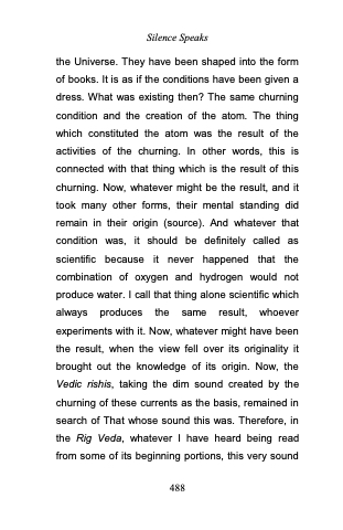 the Universe. They have been shaped into the form of books. It is as if the conditions have been given a dress. What was existing then? The same churning condition and the creation of the atom. The thing which constituted the atom was the result of the activities of the churning. In other words, this is connected with that thing which is the result of this churning. Now, whatever might be the result, and it took many other forms, their mental standing did remain in their origin (source). And whatever that condition was, it should be definitely called as scientific because it never happened that the combination of oxygen and hydrogen would not produce water. I call that thing alone scientific which always produces the same result, whoever experiments with it. Now, whatever might have been the result, when the view fell over its originality it brought out the knowledge of its origin. Now, the Vedic rishis, taking the dim sound created by the churning of these currents as the basis, remained in search of That whose sound this was. Therefore, in the Rig Veda, whatever I have heard being read from some of its beginning portions, this very sound